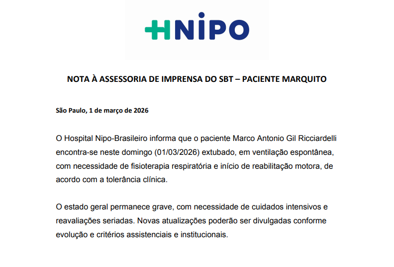 Na atualização mais recente, o hospital Nipo-Brasileiro informa que Marquito foi extubado. Apesar disso, o caso continua sendo considerado grave, com necessidade de cuidados intensivos.