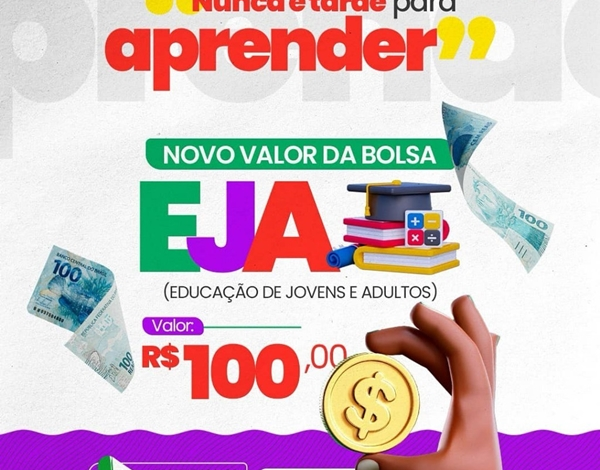 Este ano, a gestão municipal traz uma excelente notícia para os estudantes: foi aprovado no orçamento o aumento da bolsa de incentivo ao estudo, que passou de R$ 80,00 para R$ 100,00. O benefício visa estimular ainda mais a participação na EJA e garantir melhores condições para quem deseja retomar os estudos.