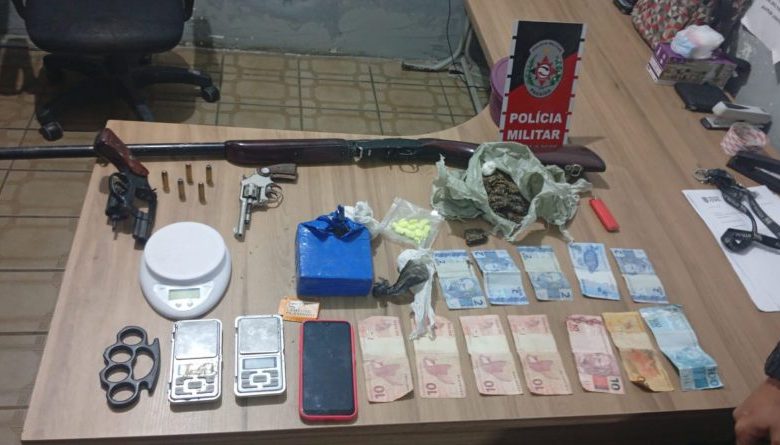 As equipes realizavam o policiamento no bairro Areial quando interceptaram um indivíduo suspeito, porém já conhecido pelo envolvimento no tráfico da região. Na abordagem, foram encontradas três armas de fogo, sendo uma espingarda e dois revólveres, munições, balanças de precisão e dois tabletes de maconha e dinheiro.